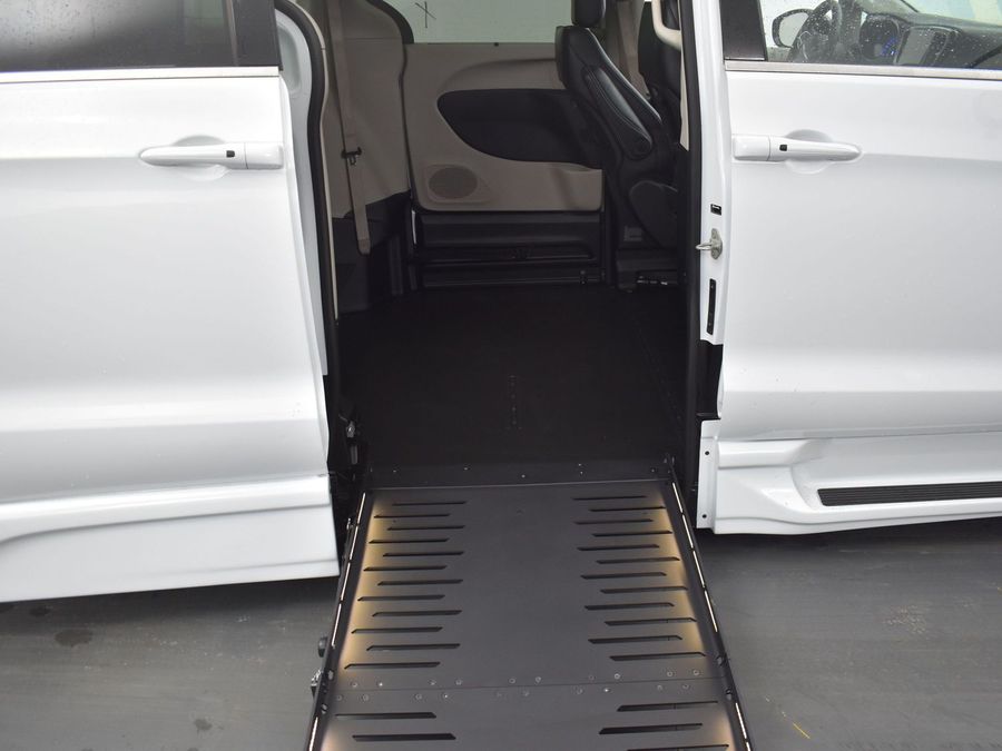 Wheelchair accessible conversion for ingress/egress with maximum door opening and interior head height. Modification includes: Lowered floor from front firewall to rear bench, power side entry bi-fold ramp, rear passenger kneeling system, remote access.