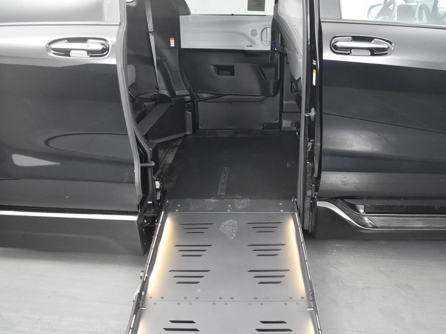 Wheelchair accessible conversion for ingress/egress with maximum door opening and interior head height. Modification includes: Lowered floor from front firewall to rear bench, power side entry bi-fold ramp, rear passenger kneeling system, remote acce