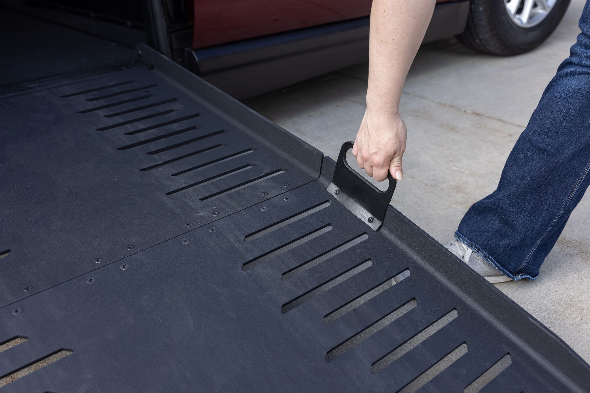 Durable, manually operated bi-fold ramp can withstand up to 1000 pounds