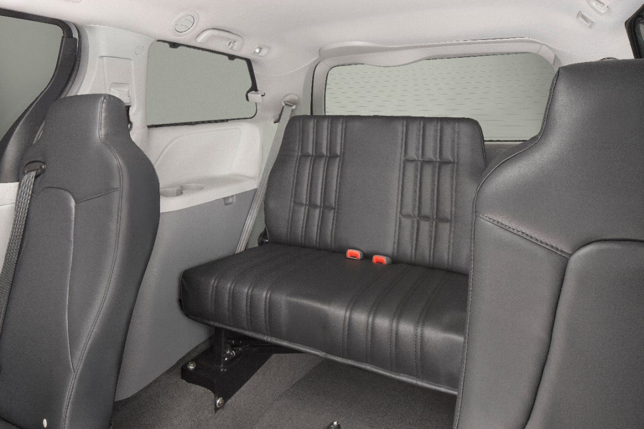 The Toyota Power Rear-Entry has a 32” wide ramp to accommodate larger wheelchairs, and a lowered-floor interior has space for up to two wheelchair passengers. With 25” of space in the middle seating position, the Toyota Power Rear-Entry offers the option for wheelchair passengers to ride in the second rows (when aftermarket seating is installed).