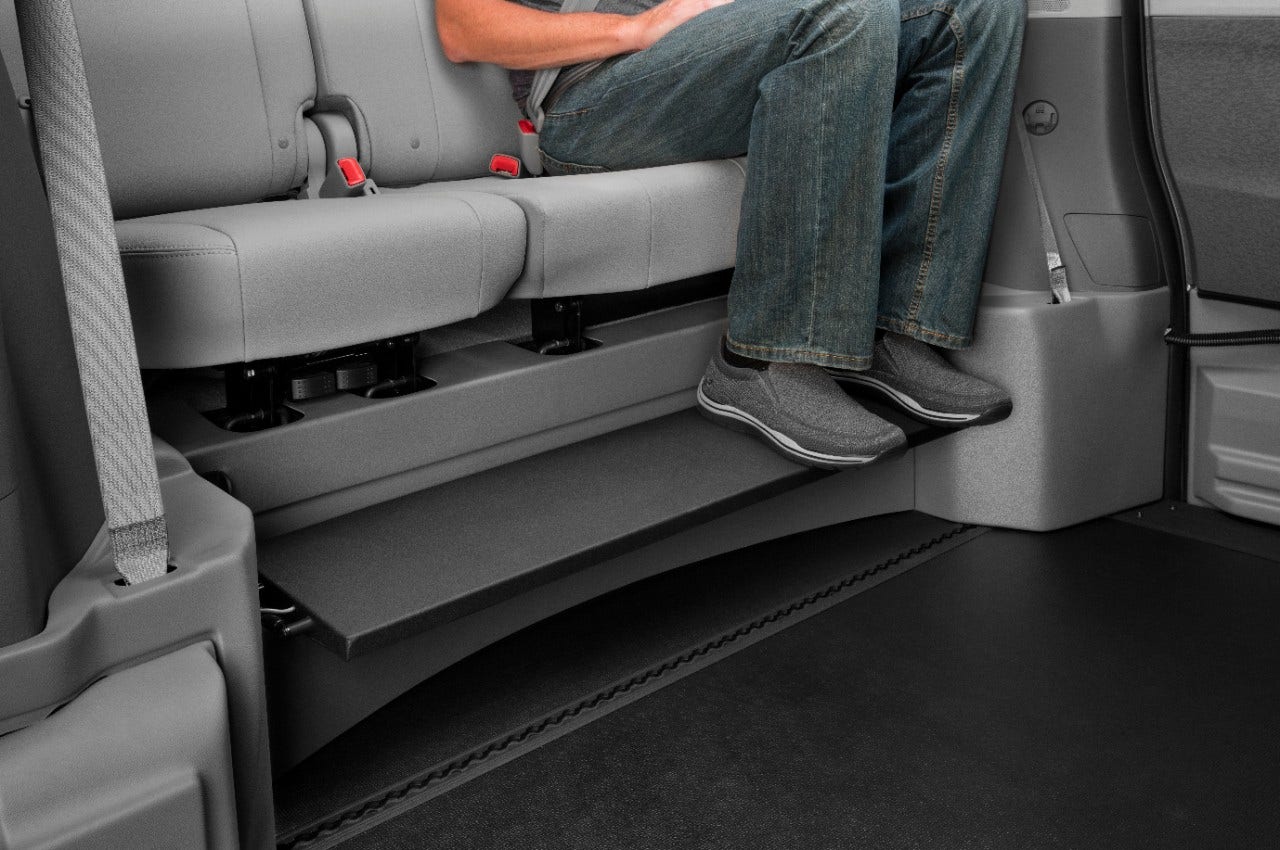 The full-length, hideaway footrest offers comfort and stows away seamlessly into the rear bench.