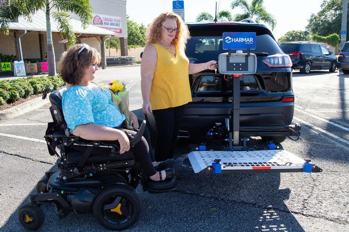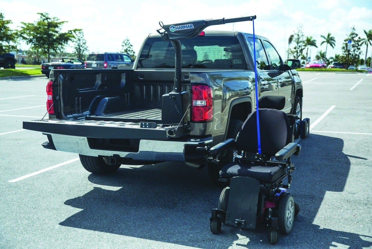 Go where you want, how you want, where you want, with a Harmar Outside Lift. This type of lift is attached to the vehicle by means of a hitch and consists of an actuator and platform which secures and carries a manual chair, scooter or powerchair.