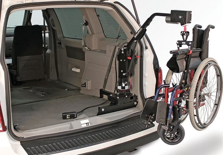 A wheelchair carrier or scooter lift rides on the inside of your vehicles. One of the greatest benefits of this option is that you can drive your scooter or wheelchair onto the platform and then let the lift do all the work to move it inside your vehicle. Another benefit is that your device is kept out of the weather.
